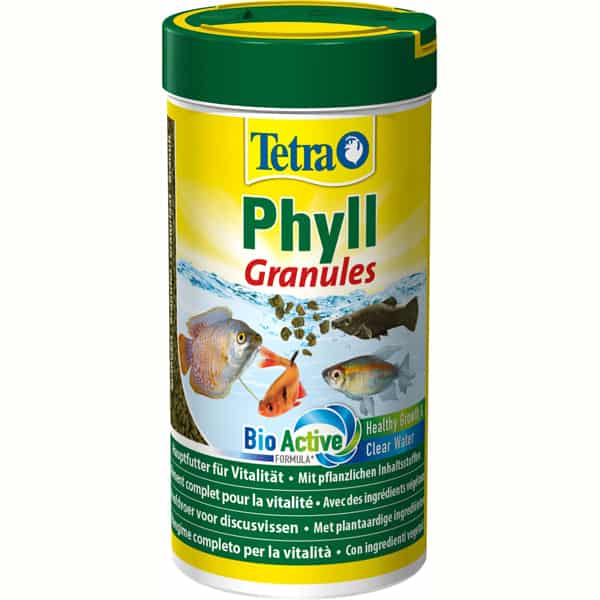 TetraPhyll, eine optimale Kost für lebendgebärende und pflanzenfressenden Zierfische -mit allen lebensnotwendigen Nährstoffen, Vitaminen und Spurenelementen. Die Flocken/Granulat erhöhen die Vitalität, das Wachstum und die Widerstandskraft. Dank Vitamin C verbessert es die Abwehrkräfte und verhindert ernährungsbedingte Mangelerscheinungen.
